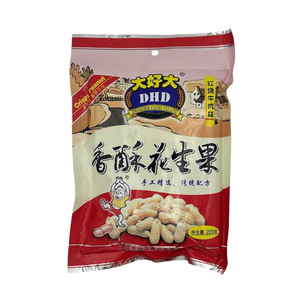 Arachidi croccanti aromatizzate al gusto manzo brasato, uno snack tipico molto apprezzato nella cucina cinese. Le arachidi vengono tostate e condite con un mix di spezie che richiama il sapore intenso e leggermente speziato della carne stufata.