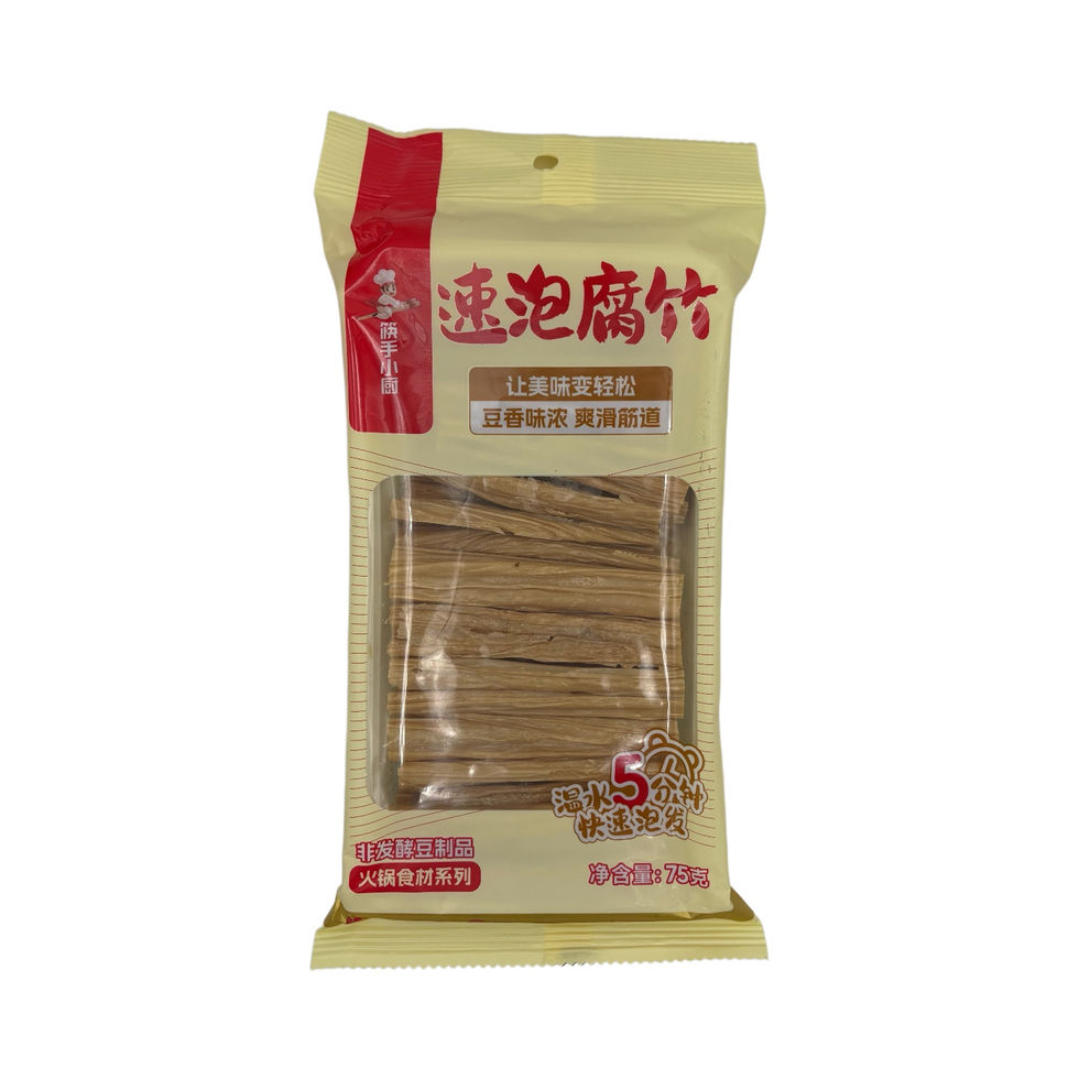 I bastoncini di tofu essiccato 速泡腐竹 sono ottenuti dalla pellicola di soia essiccata. Questa versione a ammollo rapido si reidrata in pochi minuti, risultando perfetti per preparazioni veloci come hot pot, zuppe, saltati in padella e piatti vegetariani.